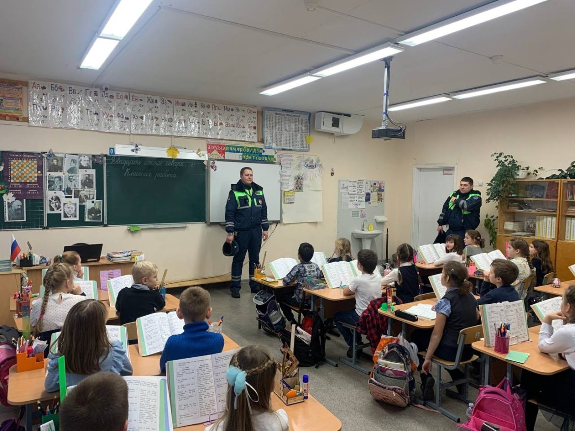Сотрудники ГИБДД Ломоносовского района провели с учениками начальных классов Яльгелевского образовательного центра урок безопасности дорожного движения.