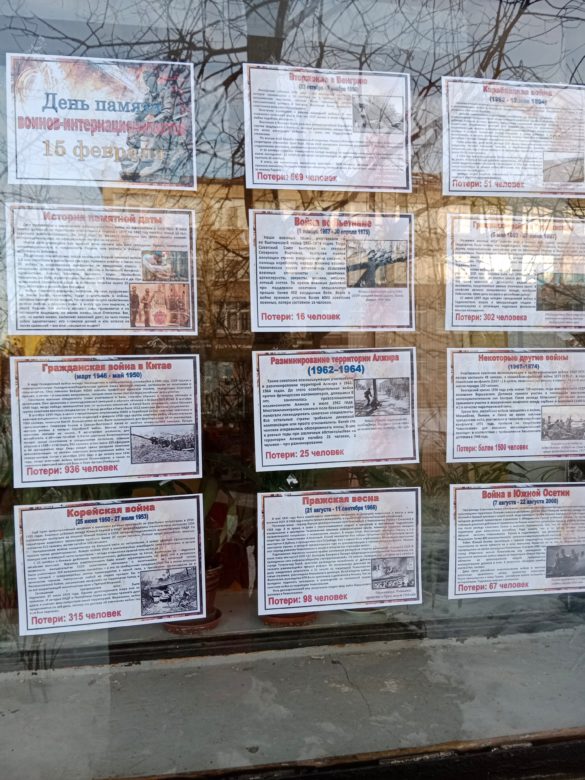В центральной библиотеке Ломоносовского района имени Н.А.Рубакина, расположенной в г. Ломоносове на улице Швейцарская, 14, подготовлена книжно-иллюстративная выставка «День памяти воинов-интернационалистов». Часть иллюстративного материала размещена в стеклянной витрине библиотеки, с содержанием которой может ознакомиться каждый желающий. Учитывая, что по соседству с библиотекой находится 426-я гимназия, возрастает шанс, что кто-то из школьников, проходя мимо витрины, заинтересуется представленными здесь материалами и захочет узнать об истории возникновения дня памяти, о причинах, почему советский союз приходил на помощь в военном противостоянии не только в Афганистане, но и в других точках земного шара.