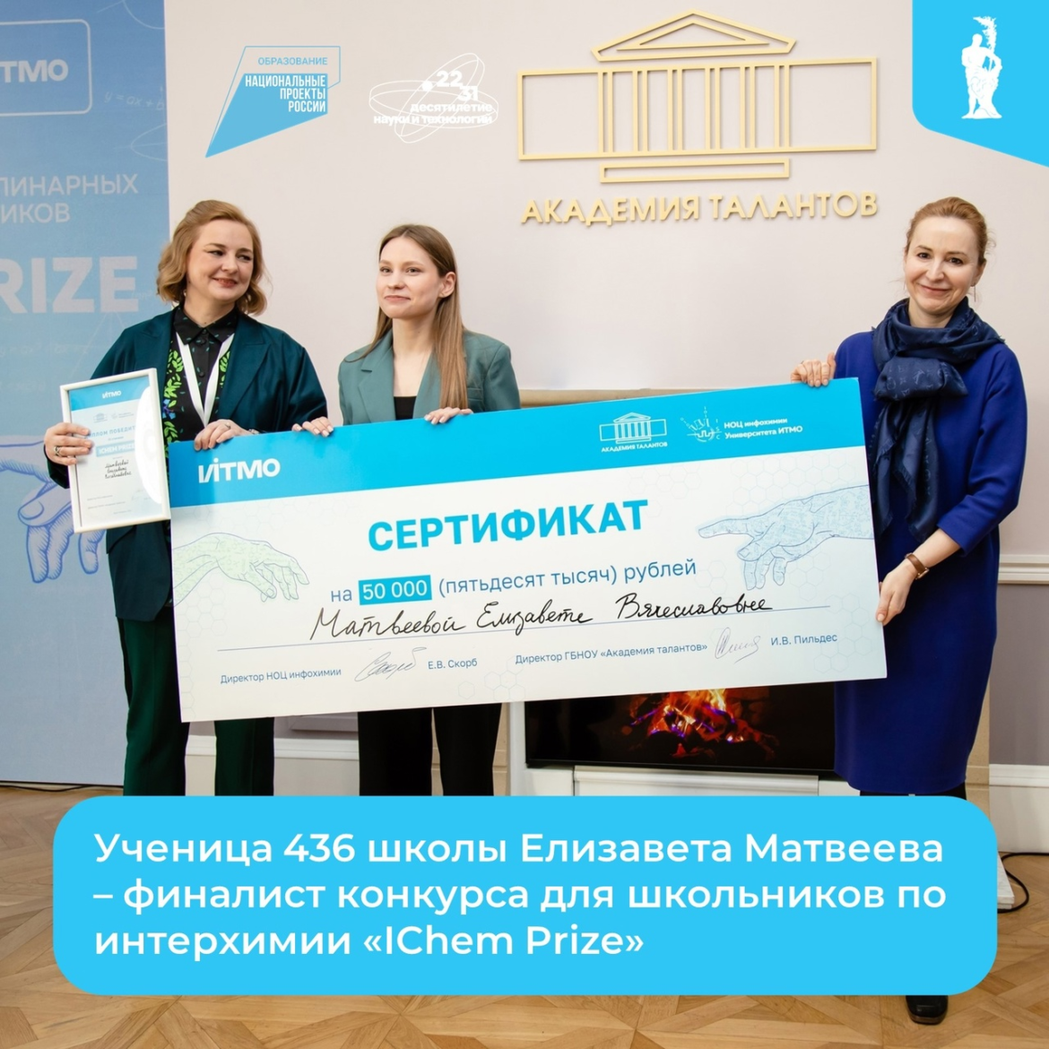 Елизавета Матвеева — ученица 11 класса школы № 436 — заняла третье место в конкурсе интердисциплинарных проектов школьников «IChem Prize». Лиза вышла в финал, достойно защитив свою проектную работу на тему «Синтез и исследование флуоресценции 5-(4-метоксифенил)-2-(тиофен-2-ил)оксазол-4-карбонитрила».