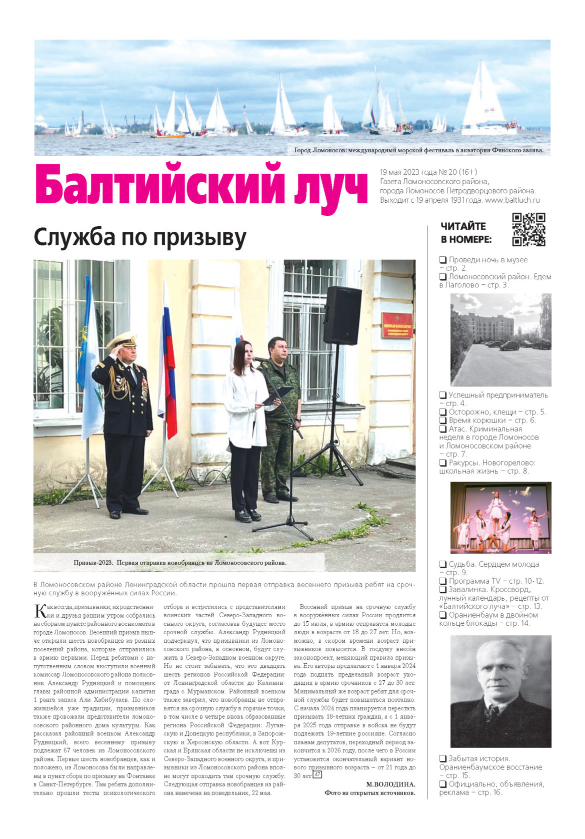 Главная Новости Новый номер газеты «Балтийский луч» (№20 от 19.05.2023 года) — уже в продаже и в ваших почтовых ящиках.