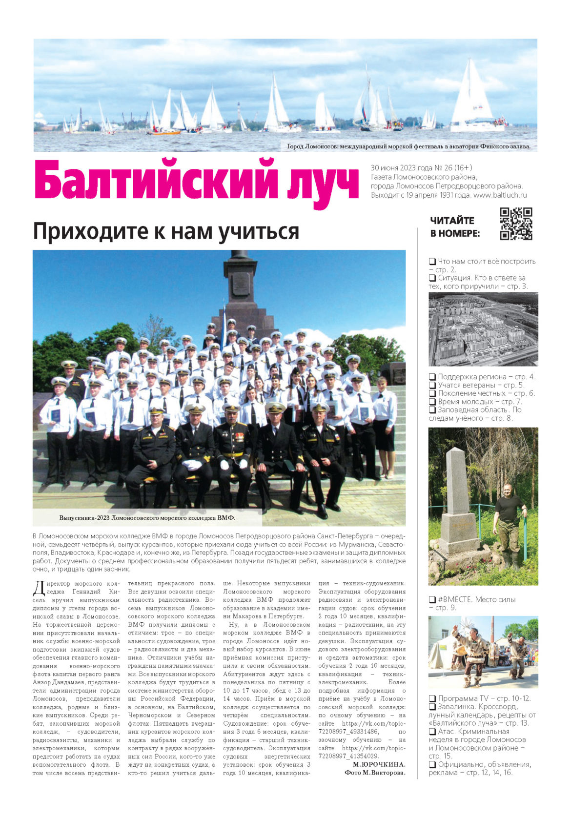 Главная Новости Новый номер газеты «Балтийский луч» (№26 от 30.06.2023 года) — уже в продаже и в ваших почтовых ящиках.