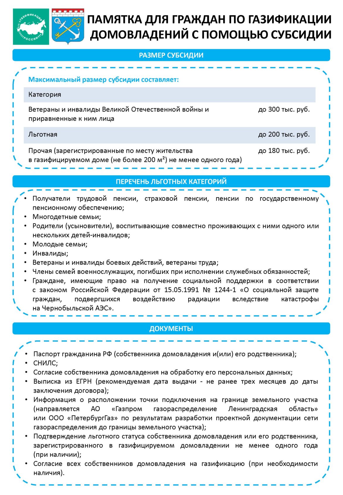 В Ленинградской области действует Порядок предоставления субсидии из областного бюджета Ленинградской области юридическим лицам, индивидуальным предпринимателям на возмещение части затрат в связи с выполнением работ по газификации индивидуальных домовладений в рамках государственной программы Ленинградской области «Обеспечение устойчивого функционирования и развития коммунальной и инженерной инфраструктуры и повышение энергоэффективности в Ленинградской области».