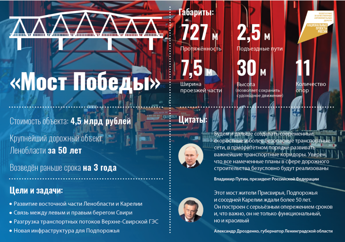 Президент России Владимир Путин в режиме видеоконференции принял участие в церемонии открытия моста через реку Свирь в Подпорожском районе Ленобласти. Мост построен регионом по нацпроекту «Безопасные качественные дороги» досрочно – за три года вместо шести. В день открытия стало известно официальное название переправы – «Мост Победы». Его пропускная способность составляет около восьми тысяч машин в сутки.