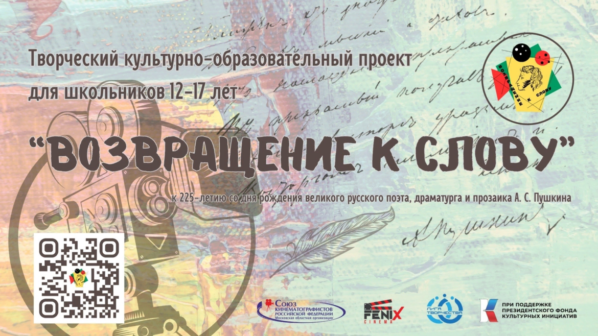 АНО «Лига творчества» при поддержке Президентского фонда культурных инициатив и Московского областного Союза кинематографистов России в период с 13 января по 30 июня 2024 года на территории РФ проводит общероссийский творческий культурно-образовательный проект для школьников 12-17 лет «Возвращение к слову».