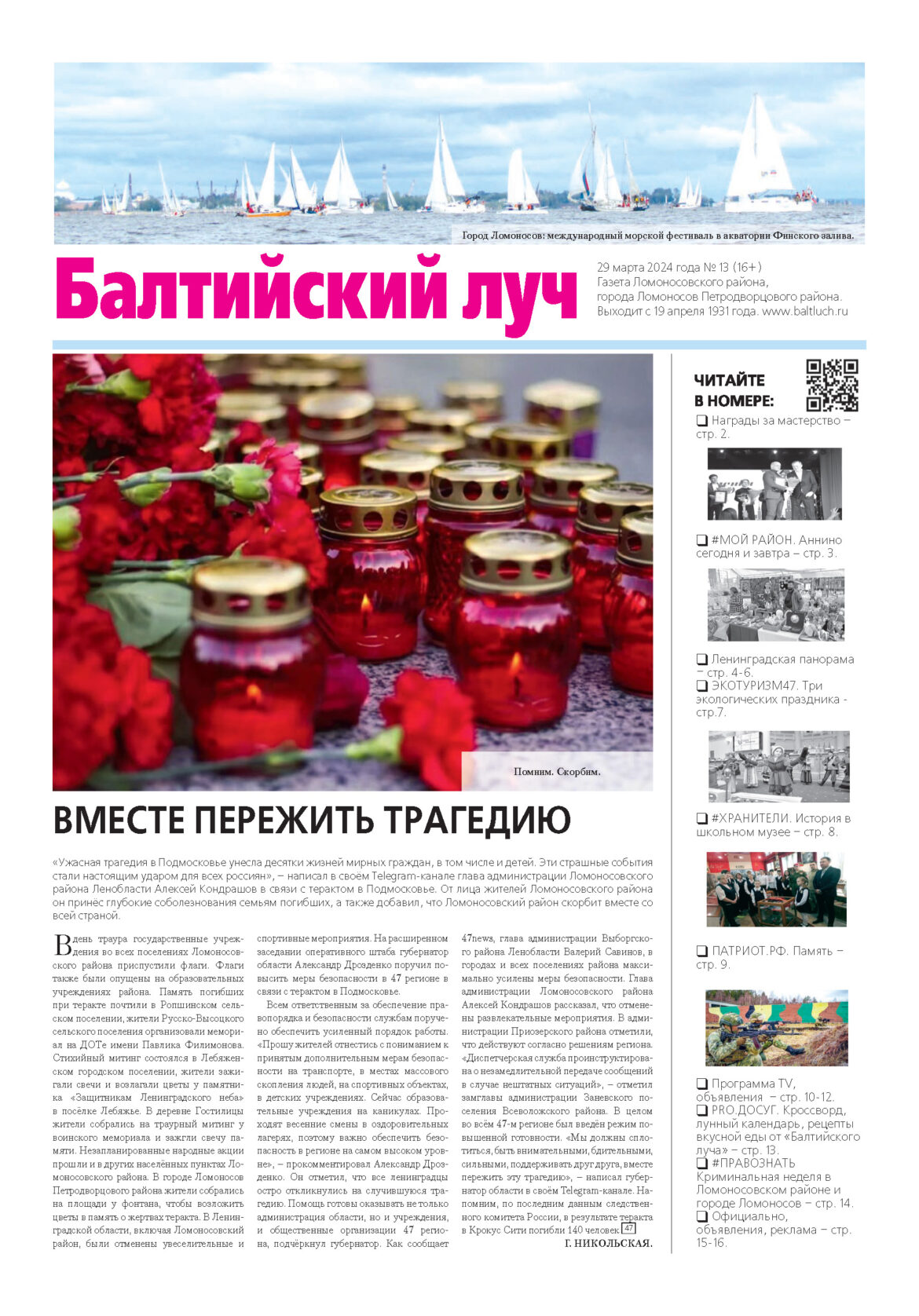 Главная #Мойрайон Новый номер газеты «Балтийский луч» (№13 от 29.03.2024 года) — уже в продаже и в ваших почтовых ящиках