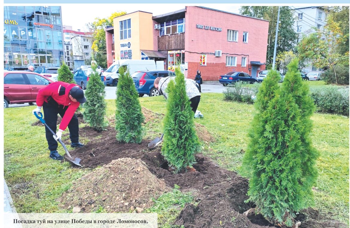 На площади на улице Победы в городе Ломоносов Петродворцового района Санкт-Петербурга высадили вечнозелёные туи, а у дома №18 на той же улице посадили кусты шиповника. В Ломоносове проходит месячник благоустройства, во время которого городские площади, улицы и дворы готовят к зимнему периоду.