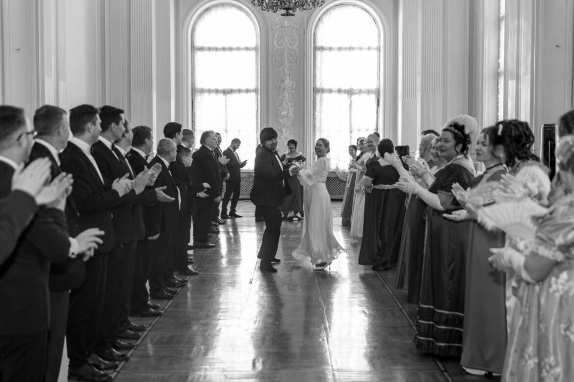 Затем последовал фуршет: кофе, чай, шампанское. После этого мы все построились на входной полонез на одной из самых красивых петербургских парадных лестниц. Поднялись по ней и попали в зал дворца, также один из уникальных. Он называется Великокняжеская столовая. Здесь уже началась танцевальная программа: исполнялись вальс, турдион, полька, кадриль, контрданс, устраивались бальные игры.