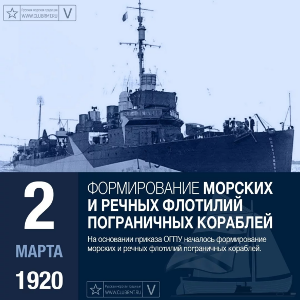 105 лет — 1920, 2 марта: На основании приказа ОГПУ началось формирование морских и речных флотилий пограничных кораблей.