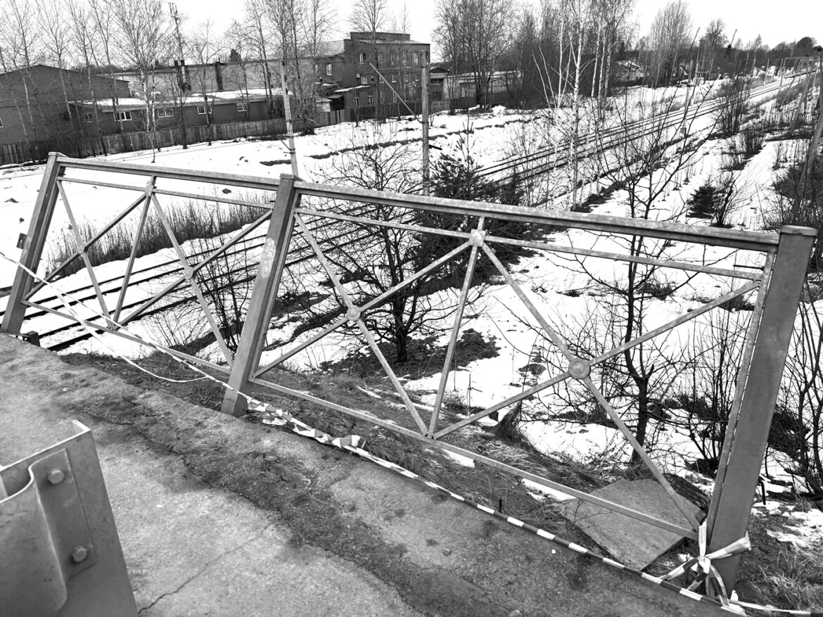 Фото сверху: Аварийные перила на мосту через железнодорожные пути на станции «Мартышкино».