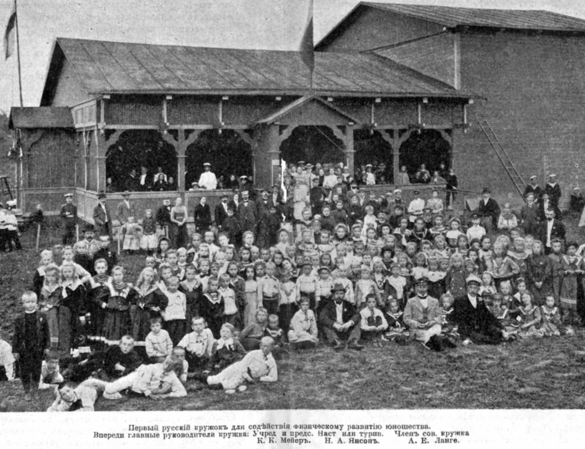 Если учесть, что в 1900-м году в Мартышкино были две лесные биржи, кирпичный завод Беляева и церковно-приходская школа, а также в посёлок приезжали дачники из других местностей, особенно из Кронштадта и Петербурга, то можно себе представить сколько детей занималось в кружке. Количество желающих стать членами спортивного общества росло, и местный дачник Карл Мейер предложил организовать секцию наподобие того, как это делалось в Англии или Германии, со своим уставом и правилами поведения. На этом идеи Мейера не иссякли, и он взял на себя аренду земли, где построил павильон для занятий спортом примерно на 500 детей. Помещение деревянного павильона – просторное, высокое – устроили очень просто, снабдив целым рядом усовершенствованных гимнастических приборов. Внутри помещения были развешаны щиты с надписями: «Наша цель – развить тело для достижения здоровья», «В здоровом теле – здоровый дух», «Учись подчиняться», «Движение – жизнь», «Гимнастика развивает храбрых и смелых защитников отечества». Также Мейер устроил площадку для спортивных игр.