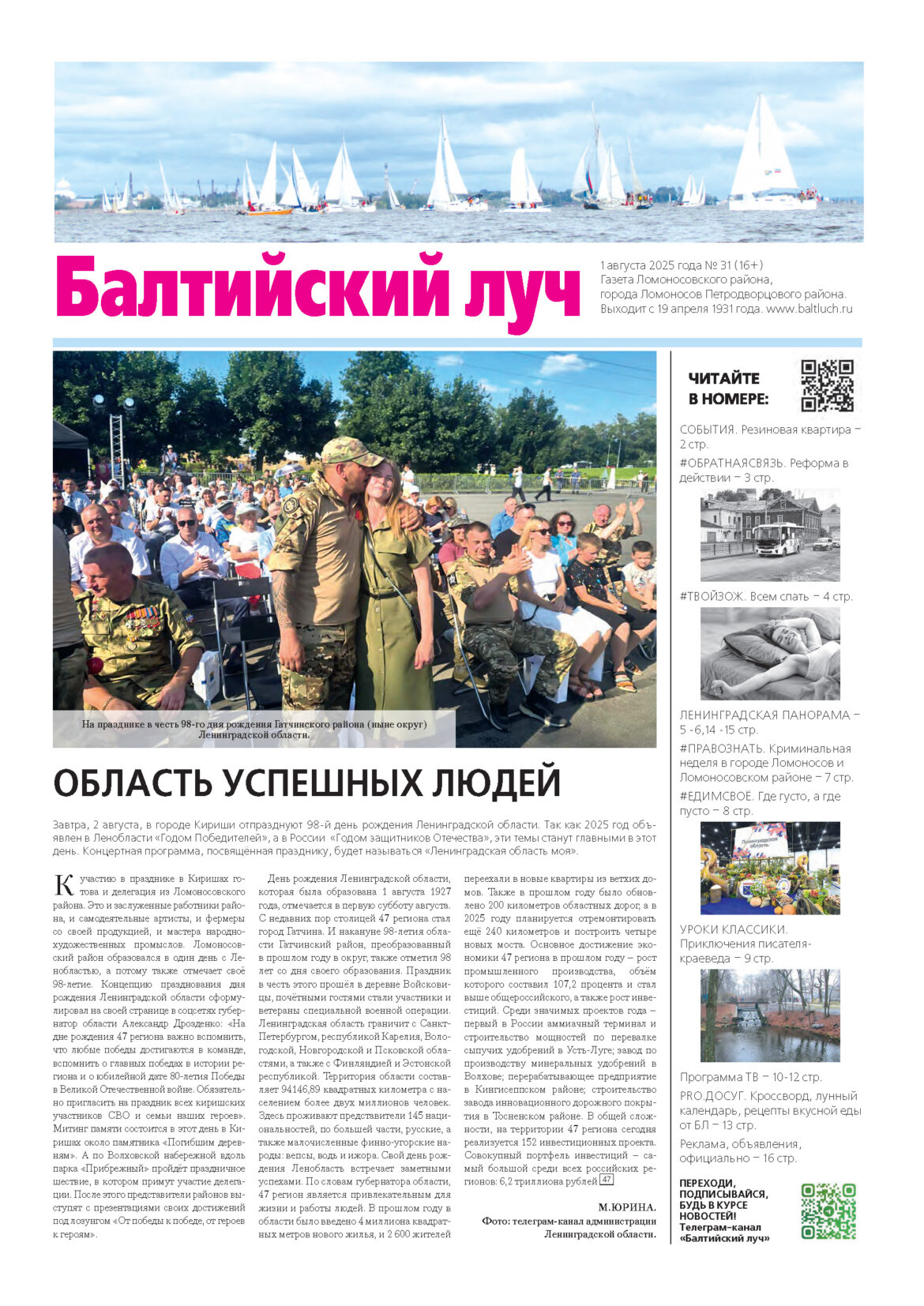 Главная #Мойрайон Новый номер газеты «Балтийский луч» (№31 от 01.08.2025 года) — уже в продаже и в ваших почтовых ящиках