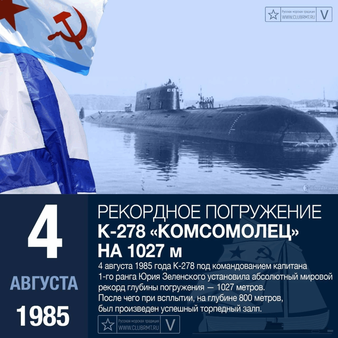 40 лет — 1985, 4 августа:Атомная подводная лодка Северного флота «К-278» (с октября 1988 года — «Комсомолец», командир — капитан 1 ранга Ю. Зеленский, старший на борту — контр-адмирал Е.Д. Чернов) проекта 685 совершила погружение на рекордную глубину 1027 метров.