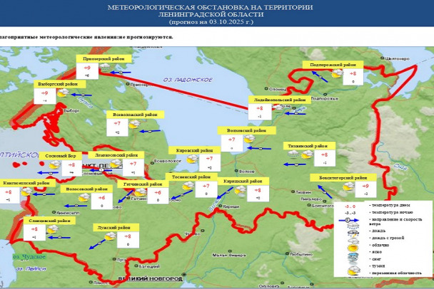 Как сообщает ГУ МЧС России по Ленинградской области, 3 октября в 47-м регионе ожидается переменная облачность без особых осадков. Ветер подует с востока со скоростью 2-7 м/с.