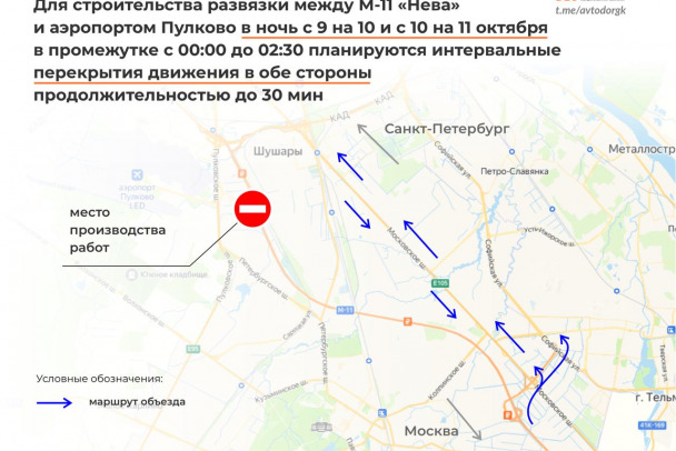 Строительные работы ограничат движение на М-11 «Нева» ночью 11 и 12 октября. Транспорт будут останавливать не более чем на полчаса.