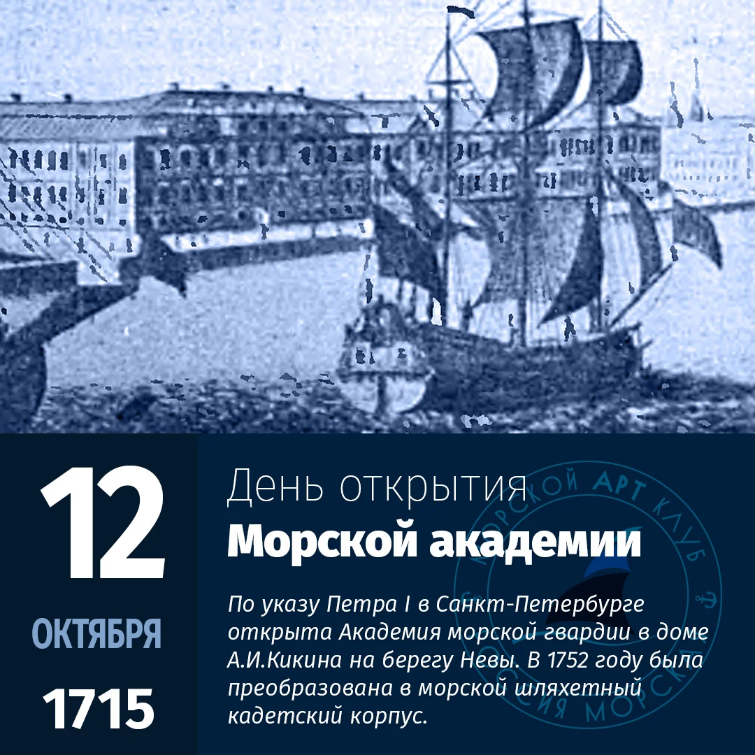 310 лет — 1715, 12 октября (1 октября по старому стилю): В Санкт-Петербурге по указу Петра I на базе старших классов Навигацкой школы (из Москвы перевели в Санкт-Петербург 300 учеников школы) основана Академия морской гвардии (Морская академия) — чисто военное учебное заведение для подготовки офицеров флота. Организационно подразделялась на 6 бригад (отделений) по 50 человек. Выпускникам академии присваивалось звание «гардемарин» (морской гвардеец). Первоначально Академия размещалась в доме адмиралтейств-советника А.В. Кикина (у современной Дворцовой площади), а с 1743 года — в бывшем дворце генерала фельдмаршала Б.К. Миниха на Васильевском острове. Занятия в Академии начались 10 октября 1715 года. Первым директором Морской академии был барон де Сент-Илер — француз, состоявший на русской службе.
