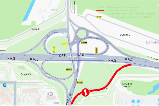 Движение по съезду С-10 будет полностью перекрыто. Для автомобилей и общественного транспорта ввели схему через съезды С-1, С-3 и С-4. Ознакомиться с ней можно по схеме.