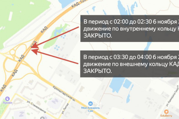 Ночью четверга на КАД около Кронштадтского шоссе временно закроют движение. Водители не смогут проехать по участку с двух часов ночи. Но будет перерыв.