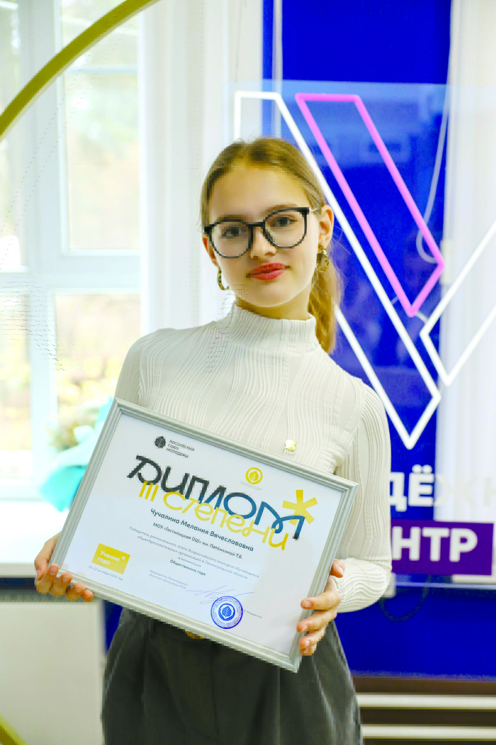 Ученица 9-го класса школы имени Т.Б. Потёмкиной в деревне Гостилицы Ломоносовского района Мелания Чучалина стала бронзовым призёром в номинации «Общественник года», завоевав диплом III степени. Принять участие в конкурсе «Ученик года 2025» ей посоветовала классный руководитель Лариса Владимировна Ганина, и она основывалась, в первую очередь, на высокой общественной активности школьницы. Мелания зачастую выступает генератором новых идей. Судите сами. В 2023 году Мелания вступила во всероссийское сообщество детей и молодёжи «Движение первых», в настоящее время является председателем первичного отделения, участвует в региональных и всероссийских проектах. Она – член молодёжного совета и представитель всероссийского благотворительного фонда «Спасибо маме за жизнь». По словам Мелании, её вдохновляет молодёжная политика, возможность помогать другим и раскрывать их таланты. «Я открыла ресурсный добровольческий центр в своей школе, мы с командой медийщиков создали медиа-проект, подкасты, поддерживая всероссийскую акцию «Россия без сквернословия». Два года действует мой проект «Сети добра – сила узора». Мне очень нравится видеть, как идеи превращаются в реальные дела», – делится Мелания. Она считает важным помогать сегодня нашим защитникам – сама плетёт маскировочные сети, нашлемники и браслеты, и обучает этому других ребят, участвует в сборах гуманитарной помощи. Волонтёрство для неё – это про действие, доброту и единство. Мелания Чучалина – активная творческая личность. Она признаётся, что обожает путешествовать, снимать видео и искать вдохновение в людях. С семи лет она изучает медиа, с двенадцати – участвует в фотоконкурсах и форумах. В 15 лет иметь за плечами столь солидный список общественных дел, это многое говорит о характере человека. Недавно Мелания побывала на слёте «Пусть творят», где познакомилась с ребятами из разных районов Ленинградской области. «За время моей активности я обрела новых друзей по всей России. Участвовала в международном фестивале «Движения Первых» в Москве, в межнациональных форумах по молодёжной политике, во всероссийских мероприятиях, таких как: «Медиапритяжение», «Творческая лаборатория», «Родные-любимые», а также в региональных проектах – «Зарница 2.0», «Школа актива», «Добро.ру». Моя жизнь – это движение, мой путь – это постоянное развитие», – так формулирует своё жизненное кредо Мелания Чучалина.