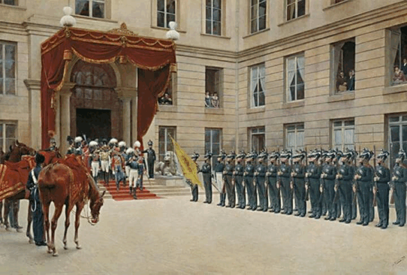 Фото: 1815, 2 декабря (20 ноября по старому стилю): Подписан Парижский мирный договор, завершивший военные действия между антинаполеоновской коалицией (Россия, Великобритания, Австрия, Пруссия) и Францией. Почетный караул у дворца Талейрана в день подписания договора нес Гвардейский экипаж.
