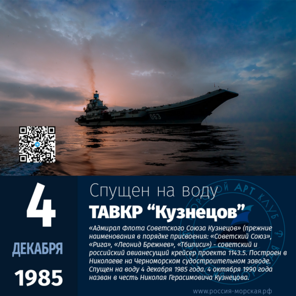 40 лет — 1985, 4 декабря: Первый советский авианосец — тяжелый авианесущий крейсер (ТАКР) «Леонид Брежнев» был торжественно спущен на воду.