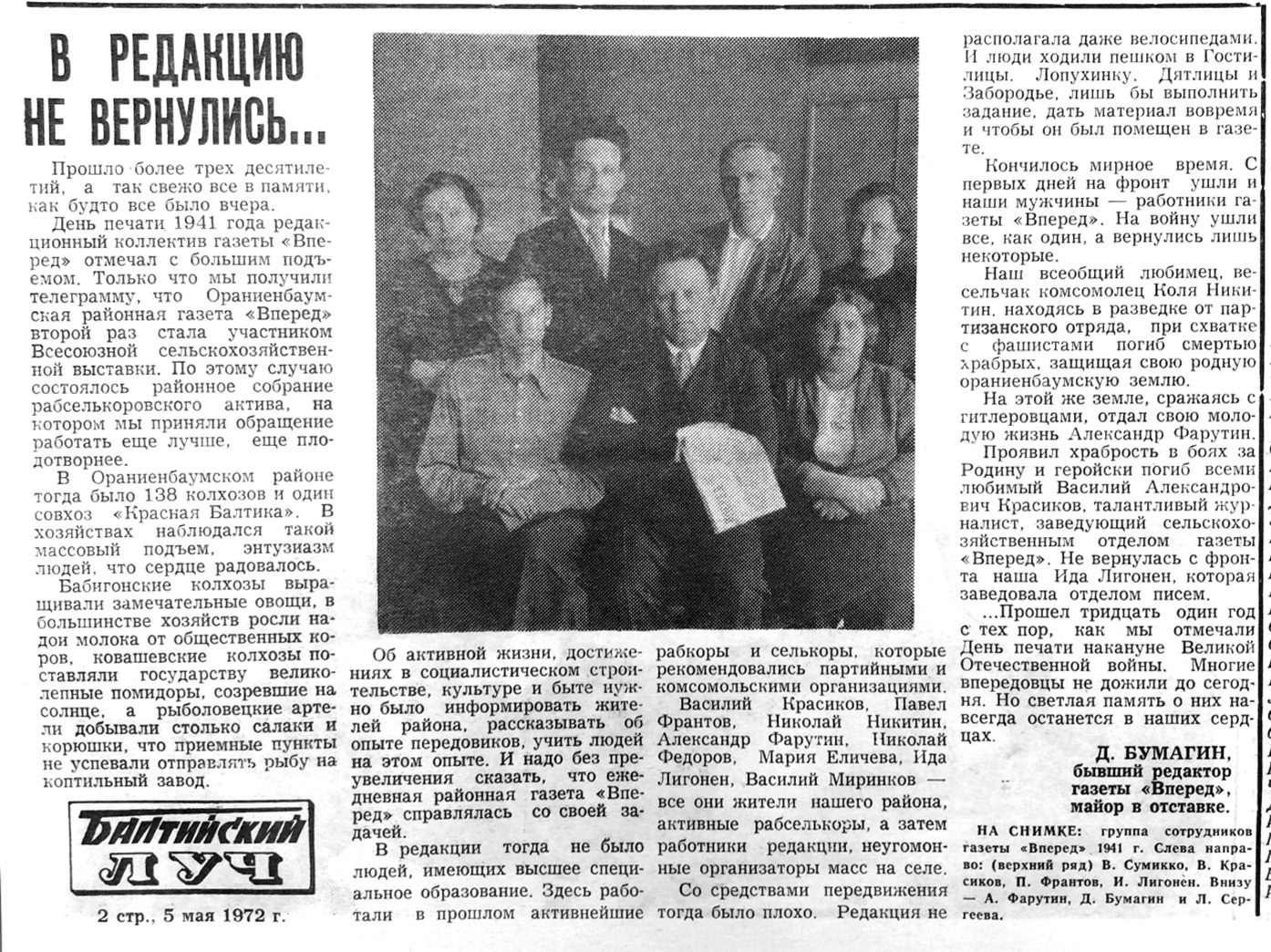 5 мая 1941 года в ежедневной ораниенбаумской районной газете «Вперёд» отмечали профессиональный праздник – день печати. Накануне пришла радостная новость – газета «Вперёд» во второй раз стала участником всесоюзной сельскохозяйственной выставки. Собрали актив, как тогда называли – рабселькоров, провели собрание. А потом семь штатных сотрудников сфотографировались на память. Четверо мужчин и три женщины: главный редактор Д. Бумагин, В. Сумикко, В. Красиков, П. Франтов, И. Лигонен, А. Фарутин и Л. Сергеева. Это фото навсегда осталось в архиве газеты «Вперёд», ныне «Балтийский луч». Все работники газеты – влюблённые в своё дело энтузиасты, не имевшие, как часто в ту пору случалось, специального журналистского образования. Рабкоры и селькоры, как правило, рекомендовались на корреспондентскую работу партийными и комсомольскими организациями. Среди них в то время в газете «Вперёд» трудятся: Василий Красиков, В. Сумикко, Павел Франтов, Николай Никитин, Александр Фарутин, Николай Фёдоров, Мария Еличева, Ида Лигонен, Василий Миринков, Л.Сергеева. Транспорта в редакции нет. И рабселькоры пешком ходят за материалом в Гостилицы, Лопухинку, Дятлицы, Забородье и другие деревни Ораниенбаумского (ныне Ломоносовского) района, чтобы выполнить редакционное задание. Пройдёт меньше, чем полтора месяца, и все мужчины и некоторые женщины редакции уйдут на войну. Двое – Николай Никитин и Александр Фарутин – погибнут на родной земле, защищая Ораниенбаумский плацдарм. Всеобщий любимец и весельчак Коля Никитин уйдёт в разведку из партизанского отряда и погибнет. На фронтах отдадут жизни за родину талантливый журналист и заведующий сельхозотделом Василий Александрович Красиков и заведующая отделом писем Ида Лигонен. Главный редактор Д. Бумагин пройдёт всю войну, дослужится до майора. А его заместитель ответственный редактор Л. Сергеева будет в течение двух блокадных лет главным редактором. Тогда, 5 мая 1941 года, она ещё не знает, что ей предстоит выпускать уникальное издание: газету самой западной неоккупированной территории советского союза. Все годы блокады и обороны Ораниенбаумского плацдарма газета «Вперёд» будет регулярно выходить. Больше того, номера будут доставляться по Малой дороге жизни в блокадный Ленинград в публичную библиотеку (ныне Российская национальная библиотека), где они и хранятся по сию пору в аккуратных папках и подшивках. В этих номерах, как в зеркале, вся история Великой Отечественной. И, что особенно ценно, – штрихи к картине жизни простых людей на территории сражавшегося Ораниенбаумского плацдарма. История обороны Ораниенбаумского пятачка – территории у Финского залива, всю блокаду грозно нависавшей над немцами, – описана многократно. О том же, что в свободных от оккупантов городе Ораниенбаум, в посёлках Лебяжье, Большая Ижора и других населённых пунктах Ораниенбаумского района все годы блокады и обороны плацдарма продолжалась повседневная жизнь мирных людей, вспоминают не так часто. А между тем, здесь в годы двойной блокады Ораниенбаума здесь работали колхозы, школы, советские учреждения. Под артобстрелами и налётами, точно так же, как в блокадном Ленинграде, жили люди. Большой землёй для них был осаждённый Ленинград, связь с которым поддерживалась по Малой дороге жизни – по Финскому заливу через Кронштадт. Врагу н