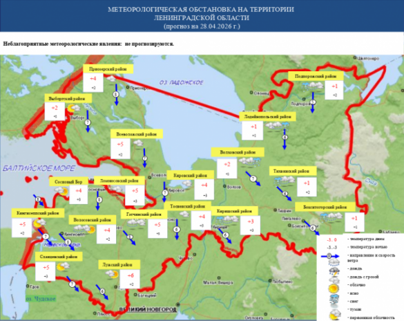 Как сообщает ГУ МЧС по Ленобласти, во вторник, 28 апреля, в целом ожидается облачная с прояснениями погода. На западе ночью без существенных осадков, днем местами возможны мокрый снег и дождь. На востоке в большинстве районов снег начнет идти с ночи, а днем местами превратится в дождь.