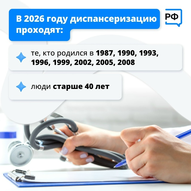Ранее 47news рассказывал, в какие месяцы лучше сходить на чекап здоровья. В 2026 году пройти диспансеризацию смогут родившиеся в 1987, 1990, 1993, 1996, 1999, 2002, 2005 и 2008 годах, а для некоторых категорий граждан она доступна ежегодно.