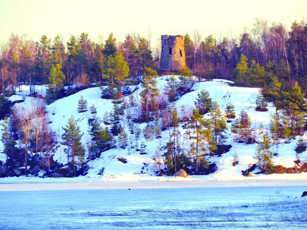 «И вот, наконец, сторожевая башня Тура на острове Верхолаз, – продолжает свой рассказ Анна. – Загадочная и неприступная, возведённая предположительно в средневековье, возможно, в 14 веке. Наш путь к ней был непрост. Нас было трое, включая инструктора. Мы пошли через лес, по навигатору. Пришлось обходить болотце и залезать на большие скалы по камням, перепрыгивать заваленные снегом трещины. Шли по свежему заячьему следу, хотя были следы и более крупных зверей. Был риск заблудиться, так как интернет в этих местах периодически пропадает. Но всё обошлось. А вот когда мы добрались до острова, то оказалось, что от него нас отделяет маленький поросший тростником пролив, который почему-то не замёрз. Пришлось обходить по открытому льду бухты, который местами трещал и намокал. Было страшновато. До башни мы всё-таки добрались. Очень романтичное место. С горы открывается прекрасный вид на залив, острова и вдалеке даже виден город Выборг. Мы остановились на обед, и наш замечательный инструктор угостил нас приготовленными тут же чаем со специями и жареными бананами. Неожиданно на нас вышли туристы – молодая пара, приехавшая по льду на чём-то очень громком, вроде воздушной подушки, прямо из Выборга. Такой путь, конечно, более надёжный, чем наш. На обратной дороге мы уже пересекали по льду всю бухту залива, на котором местами сочилась вода и виднелись глубокие мокрые следы. Изначально наш маршрут был рассчитан на то, что лёд здесь уже встал, но вышло не по нашему плану. Уже смеркалось и возвращение по льду залива – это был единственный путь. Нам повезло, что у нас был надёжный инструктор, нас было всего трое, и все мы худенькие и лёгкие. Но и под нами лёд местами предательски трещал. Но, слава богу, мы дошли, и даже ноги умудрились не замочить».