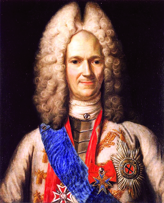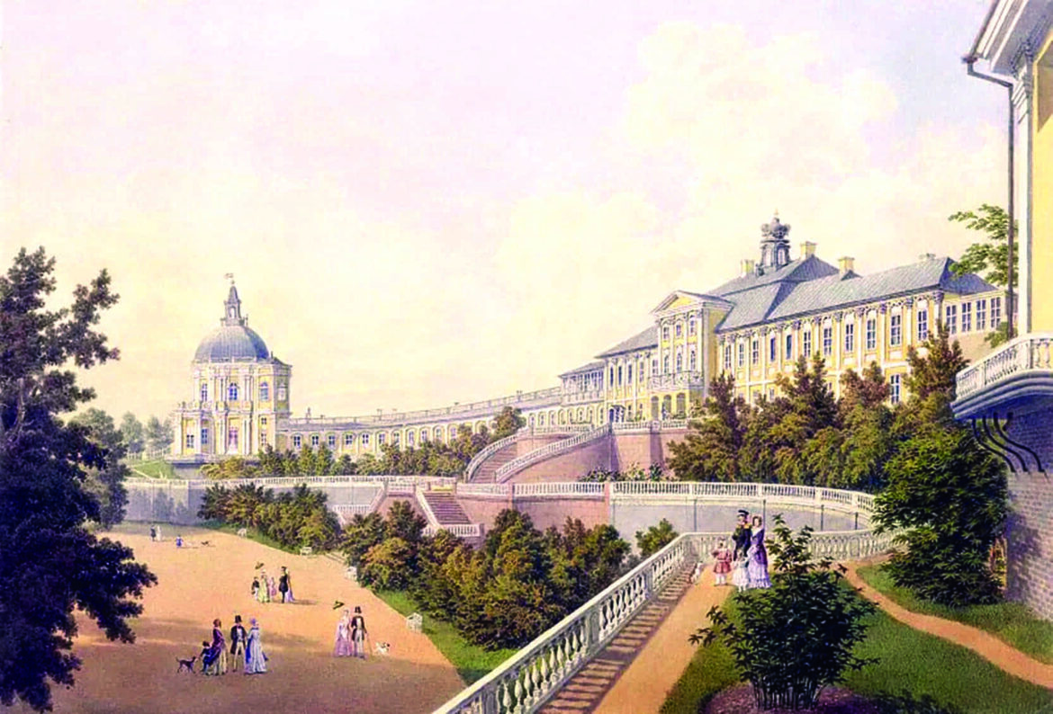 «Большой Ораниенбаумский дворец. Основатель Ораниенбаума князь Александр Данилович Меншиков название своей дачи заимствовал в Германии. В одном из старинных немецких альманахов (Penelope.1837. Leipzig.), бывших в большой моде в первой половине XIX столетия, была напечатана биография Генриэты Катарины, княгини Ангальтской, рождённой принцессы Нассау-Оранской (1637-1708 гг.). Там говорится, что княгиня, по кончине своего мужа князя Иоганна Георга Ангальт-Дессауского, удалилась в своё вдовье поместье – «великолепно-тихий Ораниенбаум». Это был красивый замок с разными пристройками, воздвигнутыми в 1683-1698 годах на границе Саксонии, в местечке Нигивиц, подаренный ей её мужем. Назвала же она свой новый замок в память своего рода Ораниенбаумом. Вскоре рядом с замком образовался городок, на рыночной площади которого до сих пор красуется в каменной вазе померанцевое дерево, сделанное из железа. В упомянутой биографической статье находим следующее примечание: «Замечательно, что князь Меншиков название Ораниенбаум перенёс в Россию, причём постройки и распланировка Ораниенбаума точно скопированы с Дессауского замка». По словам Пыляева, Меншиков «в 1714 году заложил загородный дом, развёл при нём большой сад с фонтанами, водопроводами, оранжереями, зверинцем, назвав усадьбу Ораниенбаумом». Однако, как можно видеть в найденном нами документе государственного архива министерства иностранных дел, название Ораниенбаум было уже в 1711 году. Некоторые, например, составитель «Географического словаря» Щекатов, относят построение Меншиковым дворца в Ораниенбауме к 1715 году. Но по найденным нами в архиве морского министерства документам видно, что уже летом 1712 года деревня Ораниенбаум была предметом забот князя Меншикова, который в это время задумал прорыть от заложенного или уже построенного дворца канал в Финский залив. По этому поводу А.Д. Меншиков писал 26 мая 1712 года графу Ф.М. Апраксину: «Высокоблагородный и превосходительный господин адмирал, мой особливый благодетель! Писал я ныне к господину вице-губернатору Корсакову, чтобы у меня в Аранибауме выкопать канал, к чему я чаю потребен будет». Фёдор Матвеевич Апраксин (1661-1728) – граф, один их создателей армейского флота и российского военно-морского флота, сподвижник Петра 1, генерал-адмирал, первый президент адмиралтейств-коллегии, сенатор с конца 1717 года.