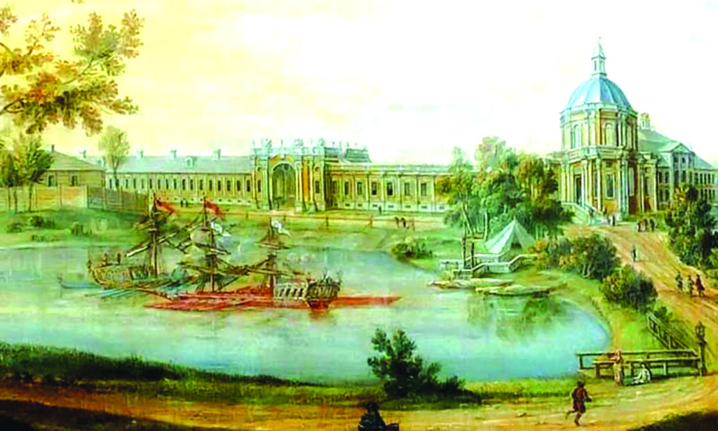 «Построена крепость в 1756 году. 23-го мая этого года ямщик Тесовского яму Новгородскаго уезда Сампсон Бобылев «в Домовой его императорского высочества Конторе» взял подряд на устройство в течение двух с половиной месяцев (до половины августа) земляной крепости по особому чертежу. Крепость делалась «о пяти бастионах, каждый полигон от шпица до другого 20 саж. в высоту – валган не выше 4 ½ футов. Крепость имела три въезда». На стенах её поставлены были мортиры и пушки – русская, шведская, лифляндская, голландская и французская. Вот как описывается местность, занимаемая Петерштадтскою крепостью, в документах, современных Петру Фёдоровичу. «Крепость Петерштадт. Вокруг нея земляной вал. Внутри крепости – каменный домик, т. е. дворец Петра Феодоровича, крытый белым листовым железом. Каменные казематы; два корпуса, каждый длиною 20 с., шириною 7 ½ с. Каменная гауптвахта, в которой содержат караул военною голштинскою командою (6 саж. на 3 с.). Около Петровского дворца направо и налево – по одному небольшому деревянному домику, дл. 6 саж., шир. 2 с., для помещения голштинских офицеров. Далее – комендантский дом, «мазанки» (12 ½ с. на 5 с.), два деревянные дома – один для голштинского генерала Левина и полковника Полмана, другой для генерал-майора Ферстера. Здесь же в крепости были построены деревянная кирка (14 саж. на 6 с.), крытая гонтом; Арсенал деревянный (48 саж. на 4 с.), состоящий под ведением капитана Фонетенера. В крепость вели каменные ворота, под ними в проезде створчатыя решетчатыя железныя полотна; над воротами осьмигранный шпиц со светлыми дверями и окнами, верх покрыт белым железом, наверху шпица медное золочёное яблоко. От ворот направо и налево две деревянныя казармы, в одной жили артиллерийские солдаты, в другой кирасирские трумпеторы. Здесь же стояли сараи для хранения пожарных труб». Валганг у крепости – верхняя часть крепостного вала, защищённая спереди бруствером, которая служит для укрытого сообщения людей, а также провоза и расположения крепостных орудий. Гонт и дранка – деревянные материалы для покрытия кровель и облицовки фасадов. Но гонт – более толстый и широкий вариант деревянной черепицы, а дранка – более тонкий и узкий. Трумпетер (кирасир) – всадник, представитель тяжёлой кавалерии XV-XIX веков, который использует в качестве
