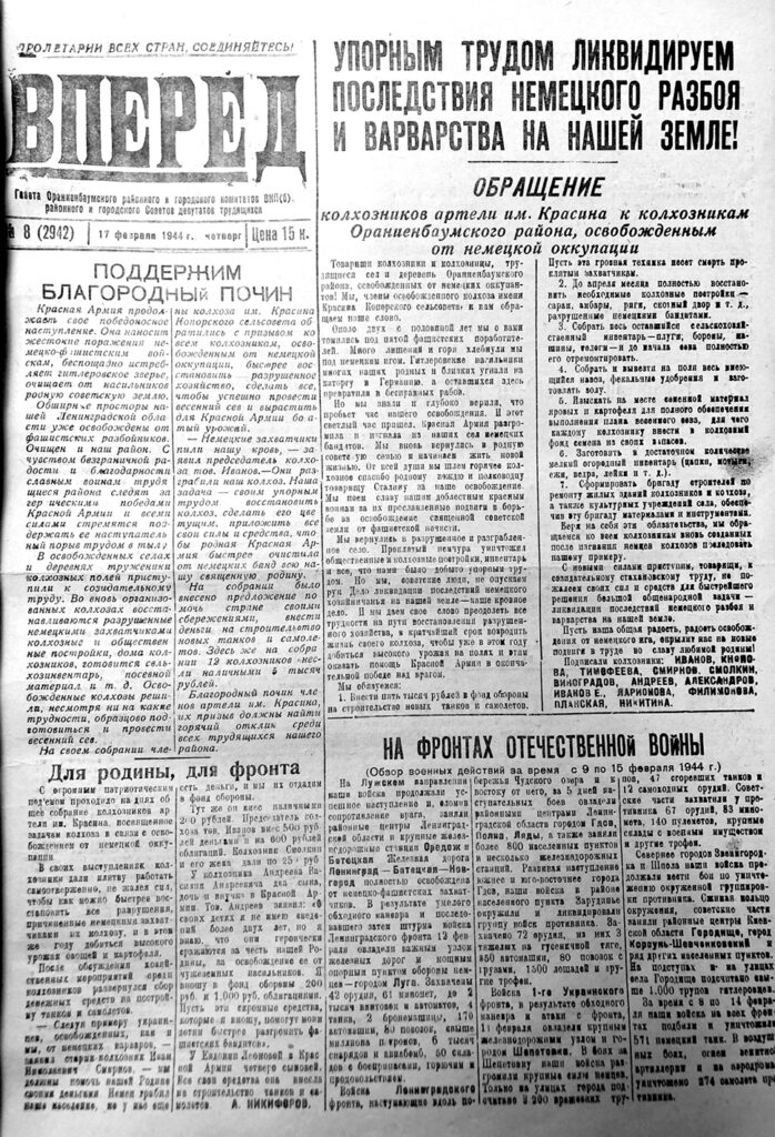 После полного снятия блокады, к началу нового, 1944-го учебного года школу отремонтировали силами родителей, учеников, учителей. 27 января 1944 года газета «Вперёд» пишет на 1-й полосе: «Вчера, 26 января, войска Ленинградского фронта, продолжая успешное наступление, штурмом овладели городом и крупным железнодорожным узлом Гатчина (Красногвардейск)». И уже 10 февраля 1944-го в газете вышла передовица о предстоящем восстановлении хозяйства района, разрушенного немецкими оккупантами. В Ораниенбаумский район возвращалась мирная жизнь. Ещё зимой в районе начали сбор строительных материалов для восстановления разрушенных домов: кирпича, досок, брёвен, инструмента. Люди, 900 дней жившие в осаде, начали искать своих эвакуированных родных. Районка, как могла, помогала им, печатая разъяснения, как правильно адресовать запросы, что делать, если место эвакуации неизвестно. Одна такая история растянулась на 30 лет. И уже в районной газете «Балтийский луч», преемнице газеты «Вперёд», рассказали её в 1974 году в статье «Нашла сына». Ленинградка Татьяна Петровна Серова и её сын потерялись в годы войны. Маленький Саша Иванов жил у бабушки в Ораниенбауме. Мать часто навещала его. Вот и 11 сентября 1941 года она поехала в Ораниенбаум к сыну, а вернуться домой не смогла. 13 сентября фашисты вошли в Лигово, и Ораниенбаумский плацдарм оказался отрезан от Ленинграда. В Ораниенбауме Татьяна Петровна устроилась на работу, вместе с местными жителями рыла окопы. Детей через Малую Дорогу жизни, проходившую по Финскому заливу, начали эвакуировать на Восток. В одной из последних партий уехал и её Саша. Закончилась война, но отыскать сына, потерявшегося в эвакуации, Татьяна Петровна не могла. Короткую справку получила она из архива: «Ваш сын был эвакуирован на станцию Ирбит Свердловской области». Ответ из Ирбита: «Ваш сын, по словам детей, оставлен в Свердловске». Следы Саши, казалось, затерялись навсегда. За поиски взялась работница ломоносовской милиции Зинаида Васильевна Соловьёва. Она начала искать мальчика в 1970 году, а нашла в 1973-м. Александр Иванов жил в Челябинске – это был уже солидный семейный человек. Татьяна Серова на самолёте прилетела в Челябинск. Поздним вечером постучалась она в дверь одноэтажного дома: «Александр Александрович тут живёт?». Перед Татьяной Петровной стоял сын, здорово похожий на своего отца – фрезеровщика-многостаночника, такой же плотный, крепкий здоровяк. «Сколько радости принесла в дом Серовой работница милиции Зинаида Васильевна Соловьёва, подарившая счастье уже не одному жителю нашего города», – так заканчивается статья в ломоносовской районной газете «Балтийский луч», опубликованная в 1974 году.