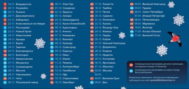 В Москву Дед Мороз прибудет 2 января, останется в столице до 3. А 6 и 7 января поезд остановится в Петербурге, в Петергофе. Ранее 47news публиковал видео с прошлого года, где можно посмотреть, как вагоны покидают станцию.»Всего он проедет более 20 тысяч километров и посетит 70 городов Дальнего Востока, Сибири, Урала, Севера и европейской части страны. Новый год команда Поезда Деда Мороза встретит в Иваново, а Рождество, уже по традиции, — в Санкт-Петербурге. В Москве поезд в этом сезоне сделает остановку на два дня — 2 и 3 января», — сказал замглавы РЖД Дмитрий Пегов.