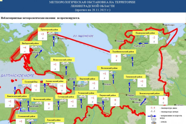 Как сообщает ГУ МЧС России по Ленинградской области, 28 ноября в 47-м регионе ожидается облачная погода, ночью с прояснениями. В темное время суток ожидается снег и мокрый снег, на западе – вместе с дождем. Дневные часы пройдут с небольшими, местами умеренными осадками. С приходом солнца ждем мокрый снег и дождь.