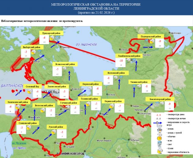 Как сообщает ГУ МЧС России по Ленобласти со ссылкой на «Северо-Западное УГМС» 20 февраля, в субботу будет облачно с прояснениями. Ночью, преимущественно на востоке, и днем, преимущественно на северо-западе, местами небольшой снег.