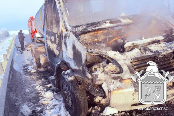 Машина с цистерной вспыхнула на дороге в Ломоносовском районе. Огонь не щадил ни кабину, ни содержимое баков.