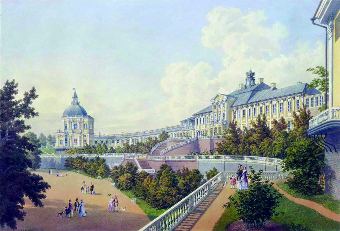 «В Большом ораниенбаумском дворце нередко бывал Пётр I. Согласно камер-фурьерским и походным журналам, посещения Ораниенбаума Петром I начались с 1714 года. 6 марта этого года государь «был в деревне у светлейшего князя в Ранибоме». Был здесь Пётр 15 октября 1714 года. 22 сентября (вместе с Екатериной) 1715 года и т.д. Иногда в ораниенбаумском дворце у Меншикова государь оставался ночевать. По смерти Петра I императрица Екатерина I также посещала Меншикова летом в Ораниенбауме. Так, 24-го июля 1725 года «ея величество изволила ездить со всем своим двором в Оранибом к генерал фельтмаршелу светлейшему князю Меншикову и там изволила кушать». Была здесь государыня и 12-го августа упомянутого года. Летом 1727 года в Ораниенбауме у Меншикова гостят император Петр II и великая княжна Наталия Алексеевна. А.Д. Меншиков очень любил Ораниенбаум и лето обычно проводил в нём. На основании хранящегося в архиве министерства иностранных дел дневника А.Д. Меншикова последние дни пребывания князя в ораниенбаумском дворце представляются так: 17 августа 1727 года князь А.Д. Меншиков после опасной и продолжительной болезни поехал со своим семейством отдохнуть в свой любимый Ораниенбаум, куда и прибыл 19-го в субботу в 6-м часу пополудни. «Тогда была пушечная стрельба, и в том же часу его светлость изволил идти опочивать и в 9-м часу встать, в 10 сесть кушать, в 11 опочивать». Вставал Меншиков обычно в 5-7 часов утра. 20-го князь слушал обедню и принимал архиепископа новгородского Феофана Прокоповича, который был также и 22-го. 21, 23 и 24 Меншиков смотрел происходившие в новой церкви работы, отделка которой составляет особую заботу князя. 28-го августа у его светлости обедали министры Вольфенбительский и Бланкенбургский, генерал-майор Сенявин, гофмаршал Шепелёв, шталмейстер Кошелев, гофмейстер Елагин, архиепископы Феофан Прокопович и Феофилакт тверской. В этот день и 29-го князь ходил в новую церковь. 30-го, в день ангела Александра Даниловича, у него в Ораниенбауме были гости: Сиверс, Гордон, генерал-лейтенант Алексей Волков, генерал-майоры князь Шаховский, Нарышкин, Фаминцын, Сенявин, бригадир Блеклой, шталмейстер Кошелев «и прочие господа морские офицеры – его светлость поздравляли с тезоименитством». «В 12 часов князь отправился к литургии, по окончании ея в параде Черниговского пехотного полка выстрелено из мелкого ружья по 3 патрона, потом была пушечная стрельба из собственных пушек». Во 2-м часу дня состоялся обед, после которого князь лёг спать. Вечером до 10-го часа играли в карты и шахматы. 1 и 2 сентября Меншиков снова посещал новую церковь, в последний раз провёл здесь два часа с 4 до 5 часов дня, несомненно, делая указания, как всё нужно приготовить к следующему дню – к освящению храма. Отсюда князь «пошёл в мыльную».