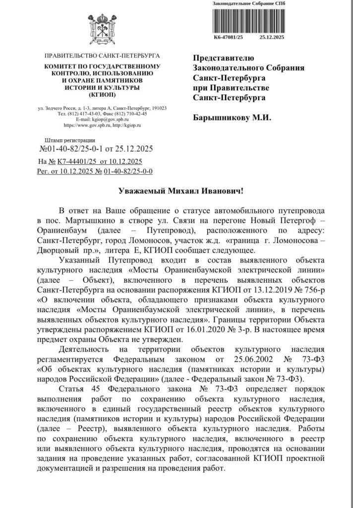 Какое чудо произошло на старом автомобильном мосту через железнодорожные пути в посёлке Мартышкино, входящем в состав города Ломоносов Петродворцового района Санкт-Петербурга, который долгие годы находится в аварийном состоянии, и какое производство обнаружено в этом же посёлке, поставившее под угрозу жизнь и здоровье его жителей, вы узнаете из материала «Кошмар на улице Связи», опубликованный в №2 «Балтийского луча» от 9 января 2025 года.