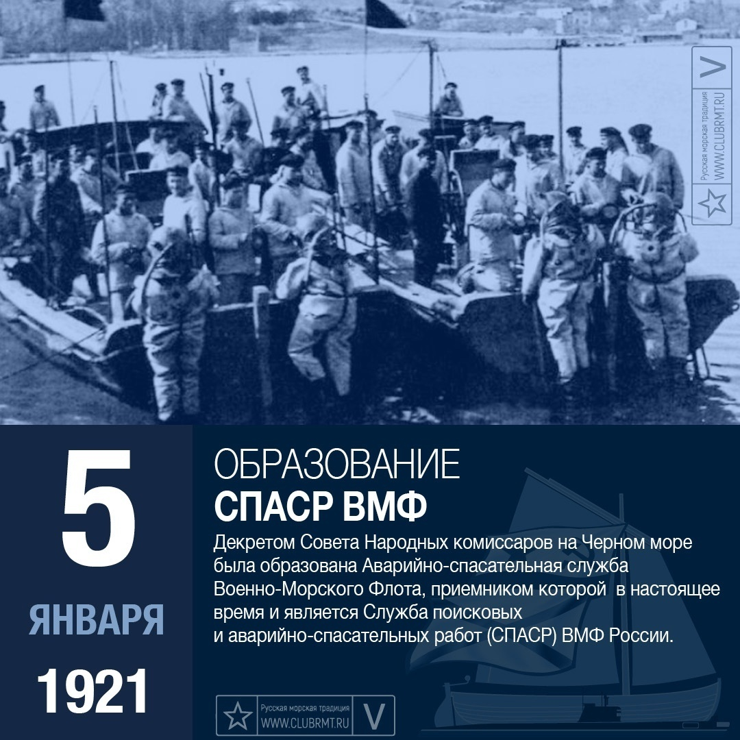 105 лет — 1921, 5 января: Совнаркомом Республики издан декрет «О работах по подъему затонувших судов в Черном и Азовском морях», по которому все спасательные, судоподъемные средства переданы в ведение Наркомата по морским делам. Этот день принято считать днем создания Управления поисковых и аварийно-спасательных работ ВМФ (УПАСР ВМФ).
