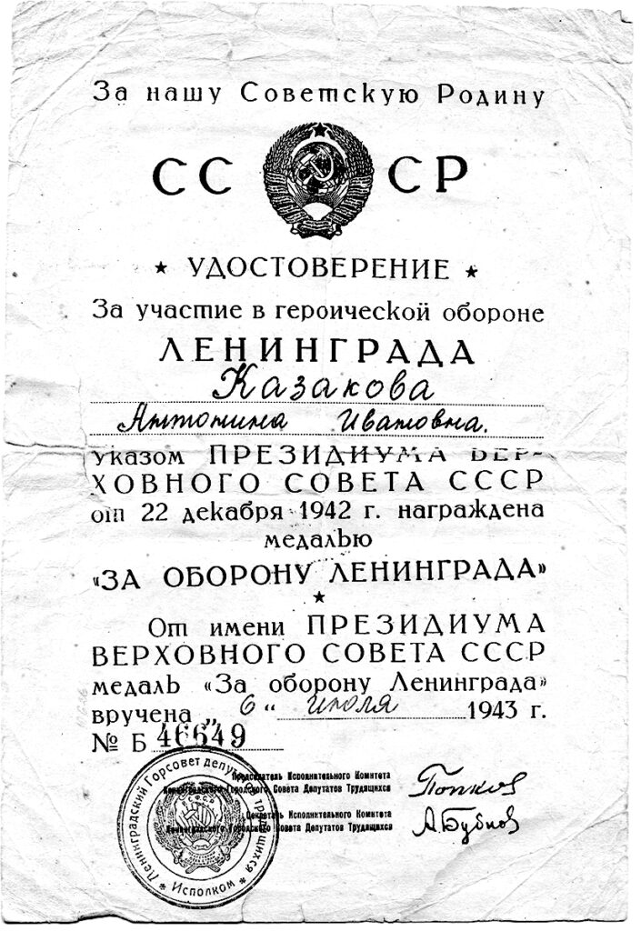 Однако вернёмся к моей бабушке Антонине Ивановне Казаковой и ремесленному училищу №11, где она работала в 1940 году. В училище было более 400 учащихся, причём более одной трети составляли ребята из Ораниенбаума и окрестных деревень. Занятия начались 16 ноября 1940 года. Первый учебный год – 1940/1941 был полноценным, а вот осенью 1941 года занятия не начинались, так как люди ушли на фронт или разъехались. Остатки персонала мобилизовали на строительство оборонительных сооружений. Антонина Ивановна Казакова работала на Гостилицком шоссе, там их команда рыла окопы. Только после того, как увидели, что по шоссе промчались немецкие мотоциклисты, они вынуждены были оставить работу и пробираться в Ораниенбаум. За участие в героической обороне Ленинграда указом президиума верховного совета СССР от 22 декабря 1942 года моя бабушка награждена медалью «За оборону Ленинграда». Медаль была вручена 6 июля 1943 года.