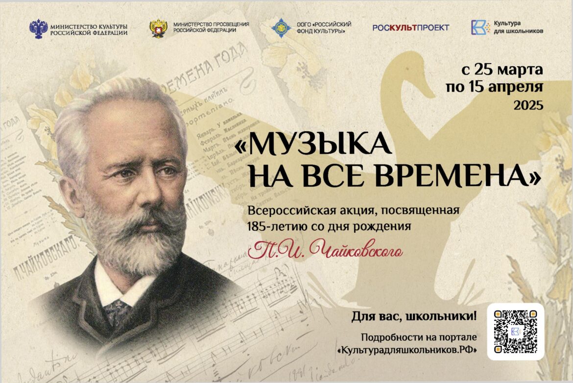 25 марта – 15 апреля 2025 года в рамках межведомственного культурно-образовательного проекта «Культура для школьников» пройдет Всероссийская акция «Музыка на все времена», посвященная 185-летию со дня рождения величайшего русского композитора П.И. Чайковского.