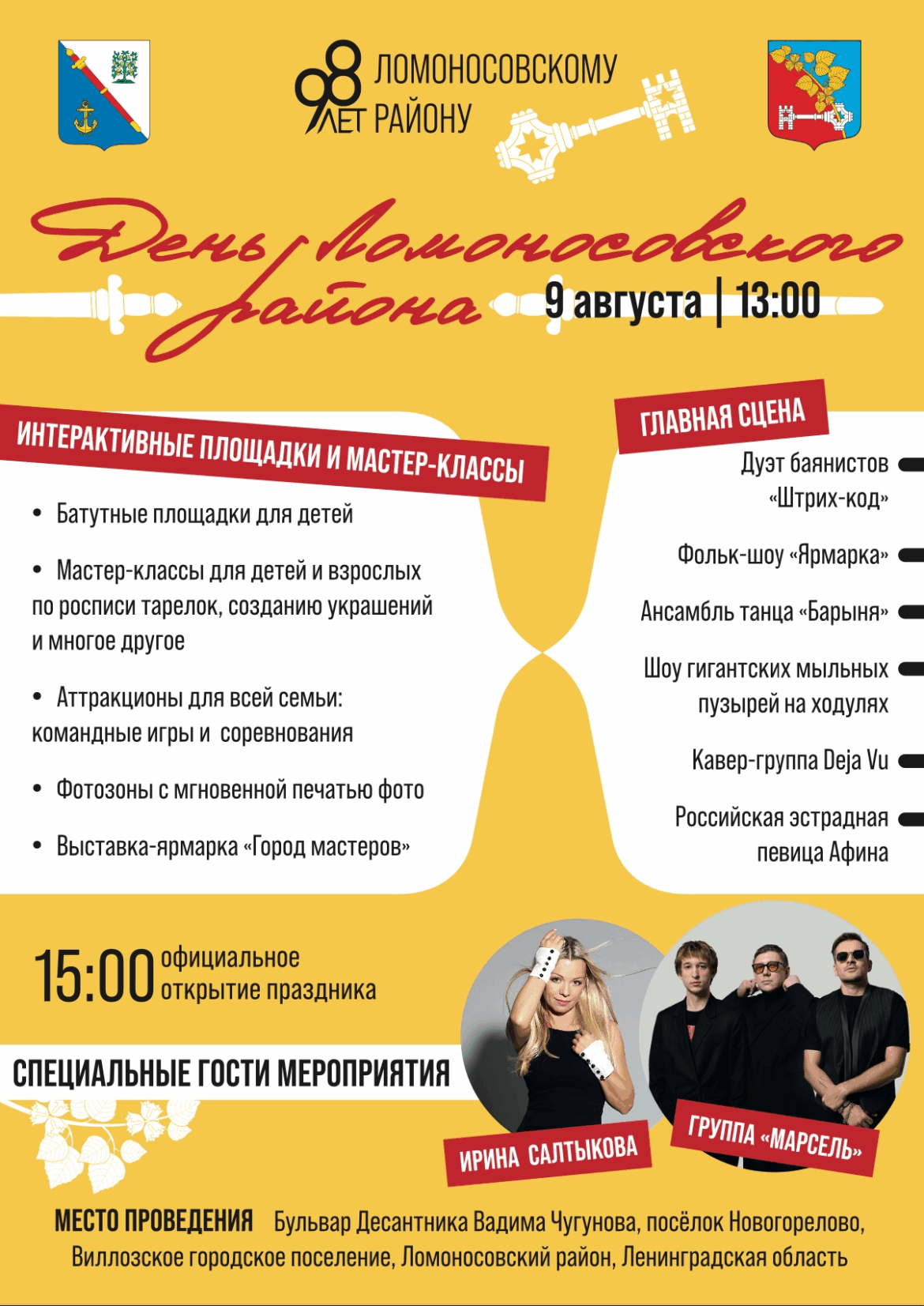 Свои лучшие хиты исполнят группа «Марсель» и певица Афина. Хэдлайнером праздника станет певица Ирина Салтыкова.